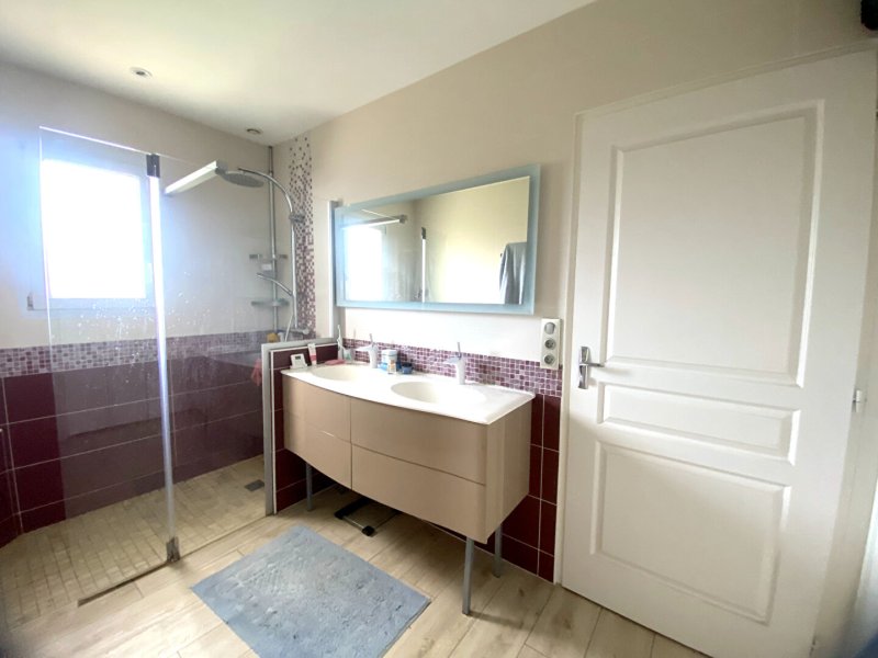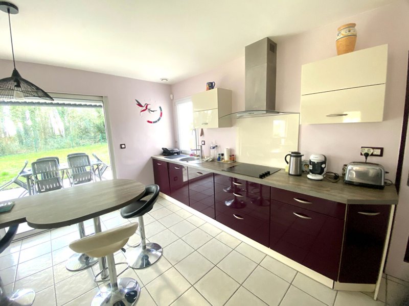 Les + : Les ouvertures sont en PVC double vitrage avec volets roulants électriques, des baies à galandage dans le salon-séjour permettent de profiter du jardin au moindre rayon de soleil, un DPE en C.