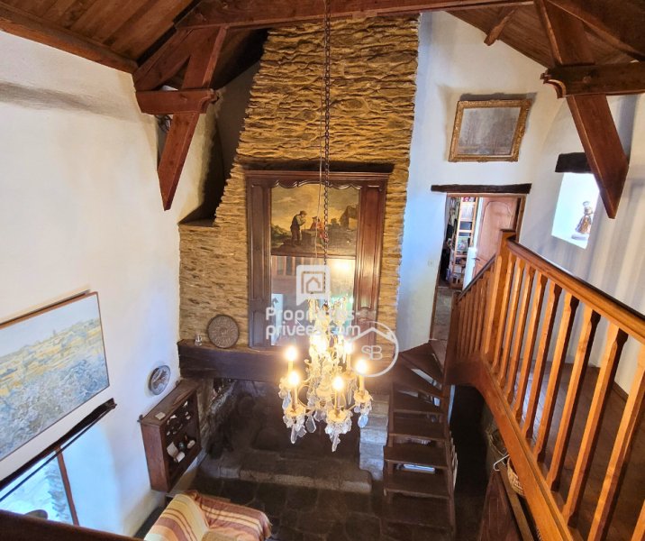 Maison principale : vaste pièce de vie avec cuisine ouverte et cheminée majestueuse, 3 chambres, bureau, salle de bain et WC indépendant.