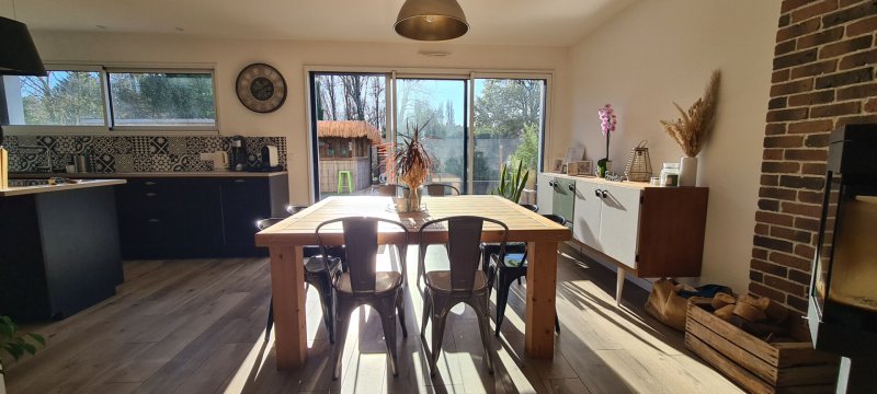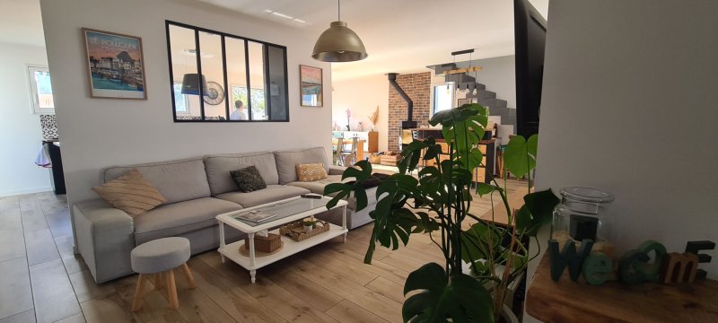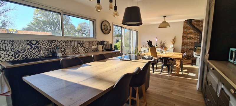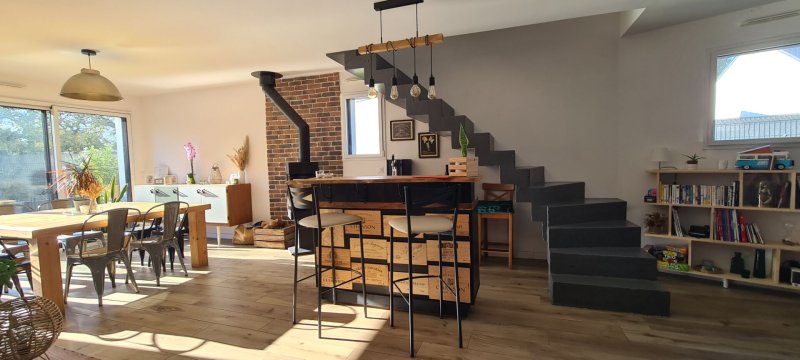Au rez-de-chaussée, la pièce de vie de plus de 62 m² se compose d'un salon, d'un espace repas et d'une cuisine moderne avec îlot central. Le poêle à bois apporte une chaleur agréable et une atmosphère conviviale. La suite parentale, équipée d'un dressing, complète ce niveau avec un espace nuit confortable et indépendant.