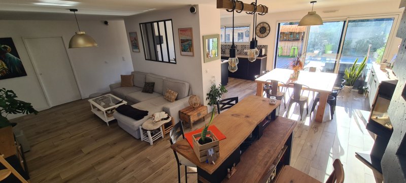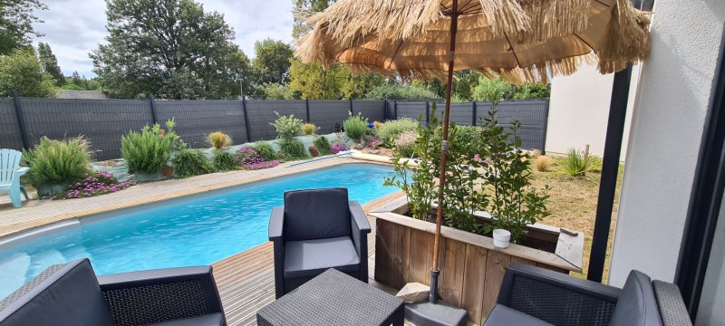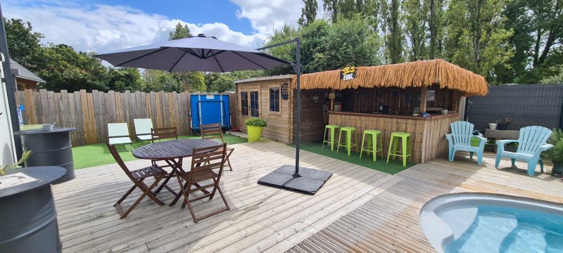 Une terrasse en bois exposée plein sud, une piscine chauffée, un chalet de jardin et une paillote aménagée composent un extérieur soigné et fonctionnel, idéal pour en profiter en toute saison.