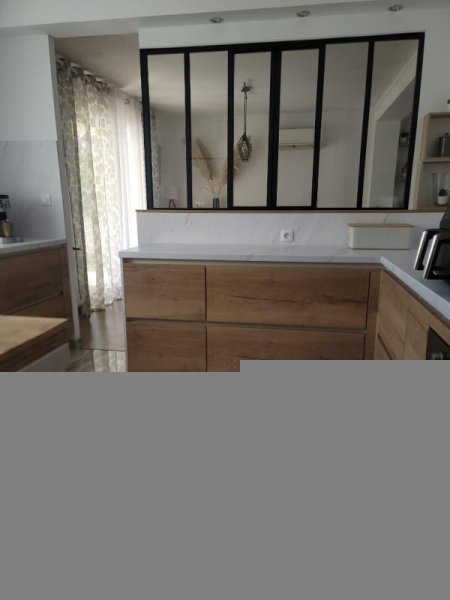 Rez-de-chaussée : séjour et cuisine de chez aviva semi fermée posée en mai 2023 climatisation réversible avec 2 split, baies vitrées en galandage garage aménagé en chambre, pouvant faire office de chambre parentale et un WC séparé.