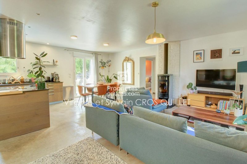 Pour la partie à vivre, une grande pièce de vie traversante, donne sur extérieur végétalisé avec terrasse en bois et piscine,
