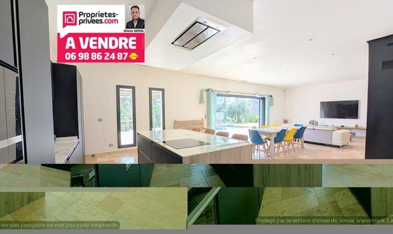 Votre professionnel immobilier OLIVIER DEMOL vous propose cette Propriété moderne et de plain-pied de 180 m² habitables. Construite très récemment en 2020. Ces caractéristiques sont rares car cette villa a su allier côté contemporain et matériaux nobles et chaleureux. Vous apprécierez un vaste séjour et cuisine américaine avec ilot central de 80 m² face à la piscine et elle-même entourée de 200 m² de terrasse en pierre travertin. vastes baies vitrées et parfaite luminosité ! 4 chambres toutes équipées de dressing dont une très grande suite parentale complète avec douche. Vous trouverez en complément une salle de bains et une seconde salle de douche. Pour un parfait confort, la propriété dispose d'un double garage de 80 m² parfaitement aménagé . Tout est entièrement de plain-pied et donc facile à vivre ! Par ailleurs les principaux aspects techniques sont :