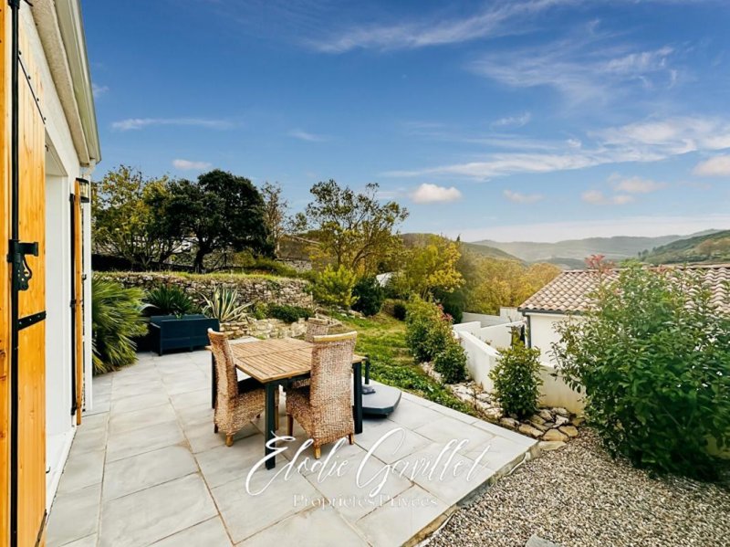 Le tout est implanté sur une parcelle généreuse de 793 m², comprenant un abri de jardin pour le rangement et une terrasse idéale pour profiter des belles journées ensoleillées. Depuis cette terrasse, vous bénéficiez d'une vue dégagée sur le mont Alaric et la nature environnante, un véritable havre de paix en pleine nature.