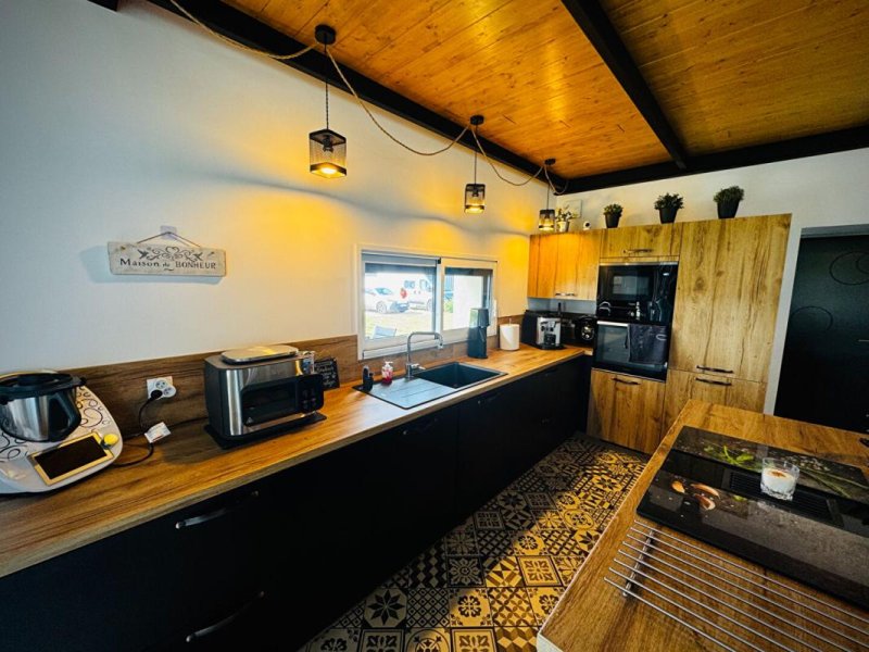 La maison très lumineuse grâce à ses multiples ouvertures, comprend une cuisine équipée, un cellier, une salle d'eau, deux chambres, une très belle pièce de vie , un chauffage au bois-pellets et une très bonne isolation qui permettent d'obtenir un très bon DPE "C", volets roulants solaires, et un assainissement écologique aux normes traite l'ensemble des eaux usées.