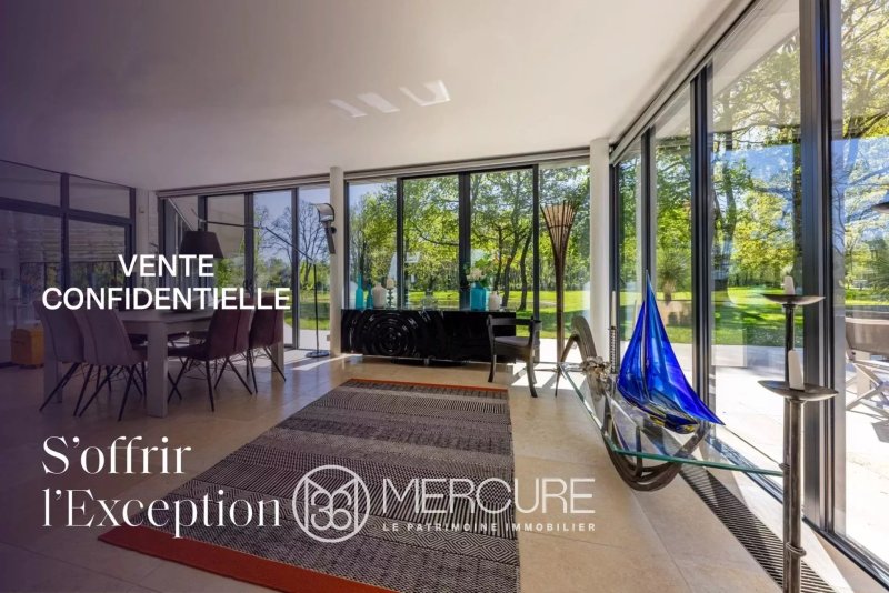 La maison s’articule autour d’une vaste pièce de vie de 155 m² en plafond cathédrale, baignée de lumière naturelle et entièrement ouverte sur le jardin : salon d’hiver avec cheminée, salle à manger, espace séjour, salle de billard. Une mezzanine surplombant partiellement cette pièce accueille un grand espace bureau. La cuisine séparée, aménagée et équipée avec soin, est complétée par une buanderie et une chaufferie. L’espace nuit, accessible depuis l’entrée, dispose d’une première...