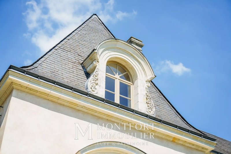 À l’abri des regards, cette demeure de style néo-classique se compose d’un corps central encadré de deux ailes latérales symétriques. Chaque façade est sublimée par un perron monumental, tandis que les tableaux en tuffeau sont surmontés de frontons alternant formes triangulaires et cintrées. Les nombreuses lucarnes en pierre de taille ornées d’ailerons parachèvent l’élégance architecturale de l’ensemble.
