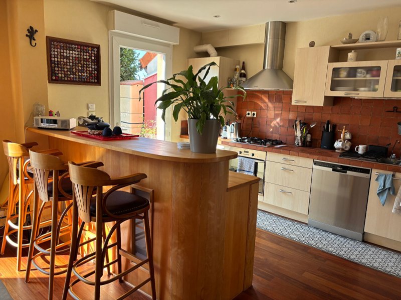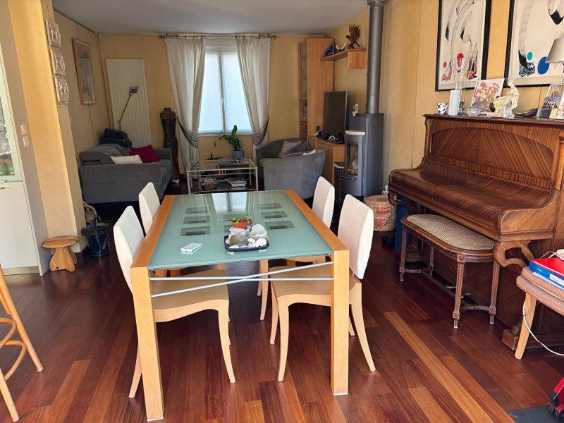 entrée, salon-séjour traversant avec poêle à bois, cuisine américaine A/E, wc, bureau non attenant. A l'étage : 3 chambres, salle de bains-douche, wc. Terrasse et coquet jardin de ville, cave, garage box. DPE - C