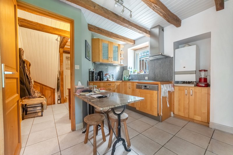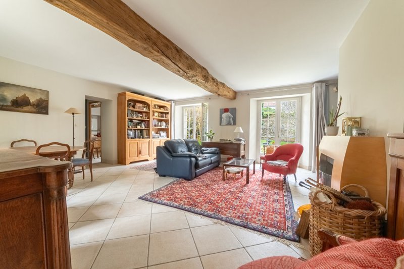 Le rez-de-chaussée offre une pièce de vie spacieuse avec cheminée fonctionnelle et le cachet des poutres apparentes, une cuisine aménagée et équipée, un bureau et une salle d'eau avec WC. À l'extérieur, la terrasse et le jardin sont parfaitement exposés sud - ouest.
