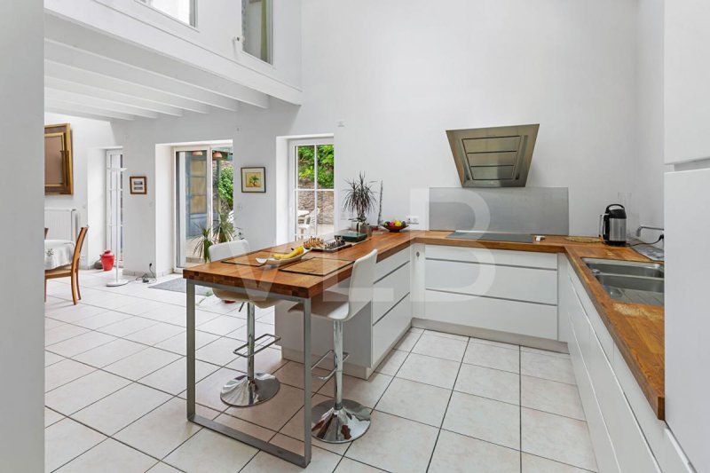 Rénovée en 2015 avec des matériaux de qualité elle se compose d'un vaste salon séjour intégrant une cuisine ouverte CONTEMPORAINE - ensemble d'environ 82 m2 donnant sur la cour intérieure - une cave à vin, une buanderie, des toilettes et placards complètent le rez-de-chaussée. (murs blancs - poutres apparentes blanches -puits de lumière)