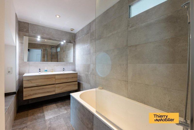 Elle se compose, au rez-de-chaussée, d'un vaste salon-séjour avec une cuisine aménagée et équipée donnant sur une cour paysagée, d'une buanderie et d'une cave.