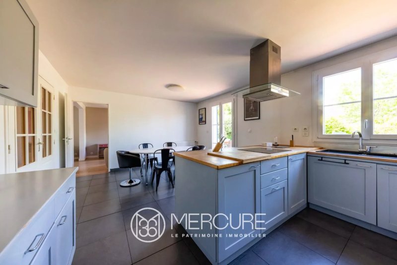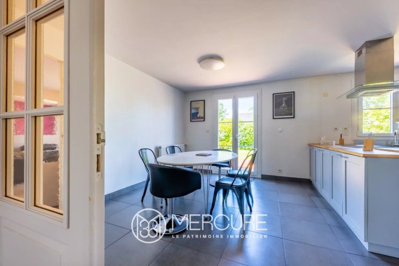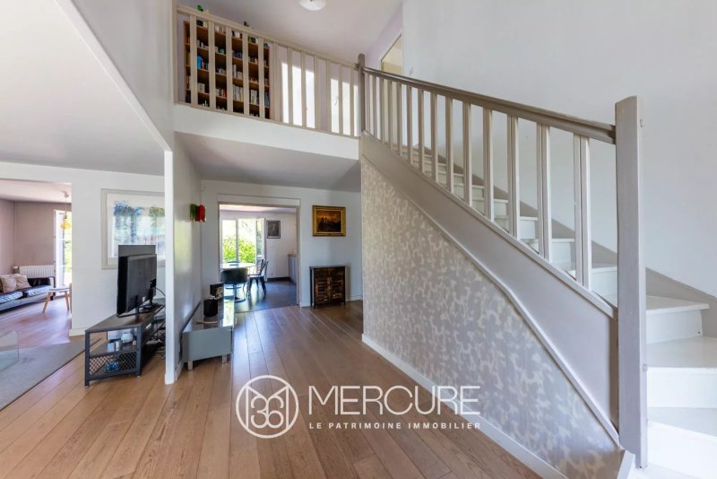 Elle dispose de 165 m² habitables avec au rez-de-chaussée, hall d’entrée cathédrale avec vestiaire, toilettes avec lave-mains, grande pièce de vie traversante est ouest avec vaste séjour salon et salle à manger, dans le prolongement une cuisine aménagée et équipée disposant d'un espace dînatoire, bureau (5ème chambre). La maison offre également la possibilité de créer si besoin une suite parentale au rez-de-chaussée avec dressing et salle d’eau. Un garage et une chaufferie lingerie viennent compléter le rez-de-chaussée.