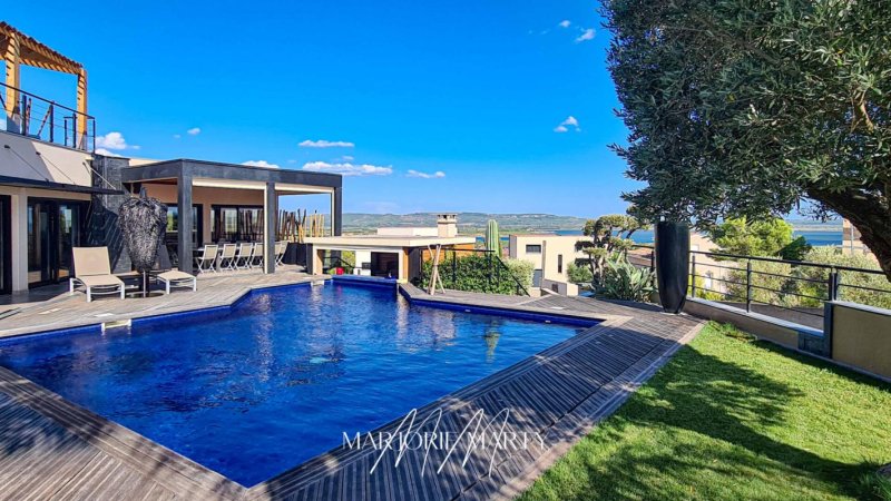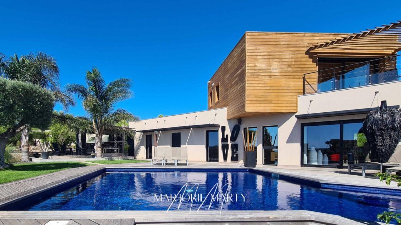 A proximité immédiate de Narbonne, quartier résidentiel, en lisière de Zone Verte, position dominante avec vue à 180 ° sur le littoral audois et l'étang de Bages, orientation plein sud, Maison d'Architecte R+1 de 2011, lumineuse, construction traditionnelle avec matériaux rares comme le GRANIT du ZIMBABWE, proposant une surface habitable de 211 m2 et une surface utile de 414 m2 sur un terrain avec arrosage automatique, paysagé et arboré d'essences méditerranéennes de 1344 m2, complété par une piscine chauffée, maçonnée et habillée d'ÉMAUX de BRIARE, traitement au sel, entourée d'une plage en PADOUK et sa cuisine d'été équipée d'un barbecue XXL et d'une plancha, dédiée, permettant de s'accouder au bar tout en restant dans la fraîcheur de la piscine. La pergola d'inspiration balinaise est en eucalyptus et bois flotté.