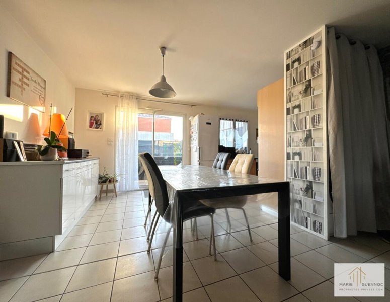 Marie GUENNOC vous propose de découvrir cette agréable maison de plain-pied, très bien entretenue, offrant confort et luminosité. Construite en 2011, elle séduit dès l'entrée par sa pièce de vie lumineuse grâce à sa double exposition Est/Ouest. Le séjour, chaleureux et convivial, est doté d'un poêle à granulés récent (2021) et ouvert sur une cuisine aménagée et équipée, complétée par une arrière-cuisine.