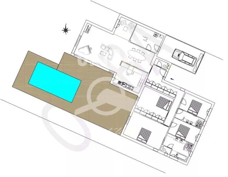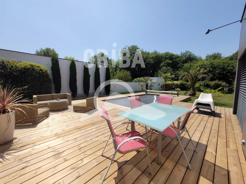 En extérieur, une grande terrasse bois de 100m2, ainsi qu'une piscine avec option nage à contre courant, sans vis-à-vis, accessible du salon, de la cuisine et de 2 chambres.