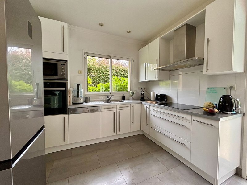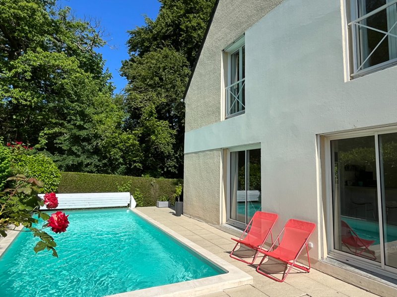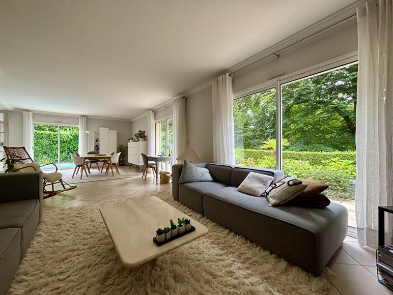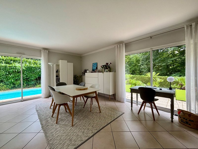 Le séjour double de près de 50 m², exposé sud-ouest, baigne dans la lumière naturelle et s'ouvre sur un jardin sans vis-à-vis avec piscine chauffée. La cuisine indépendante, moderne et entièrement équipée, ravira les amateurs de convivialité.