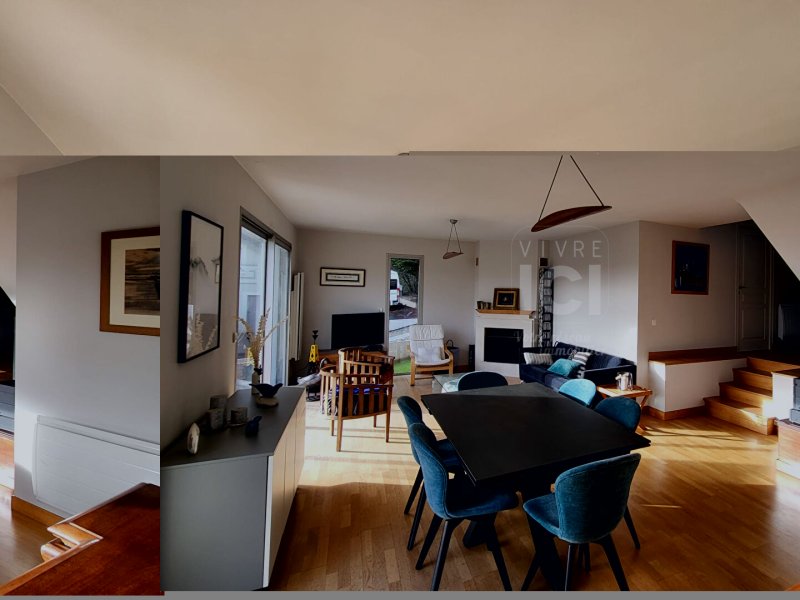 Développant 134 m² habitables (loi carrez) et 197 m2 au sol, elle s'organise autour d'une belle pièce de vie de près de 50 m2, chaleureuse, exposée plein sud, avec parquet, cheminée et cuisine semi ouverte, le tout prolongé par une vue imprenable sur la nature. Une luminosité permanente et une atmosphère conviviale rare sur le secteur.
