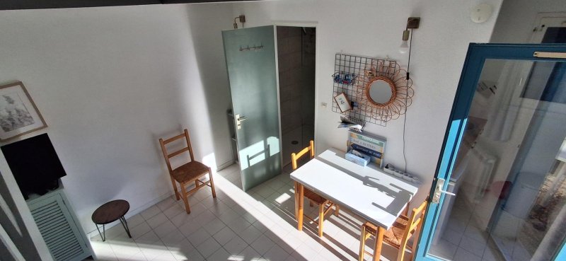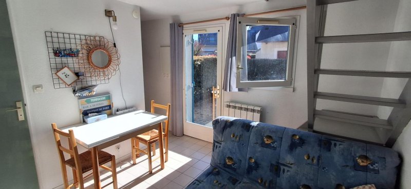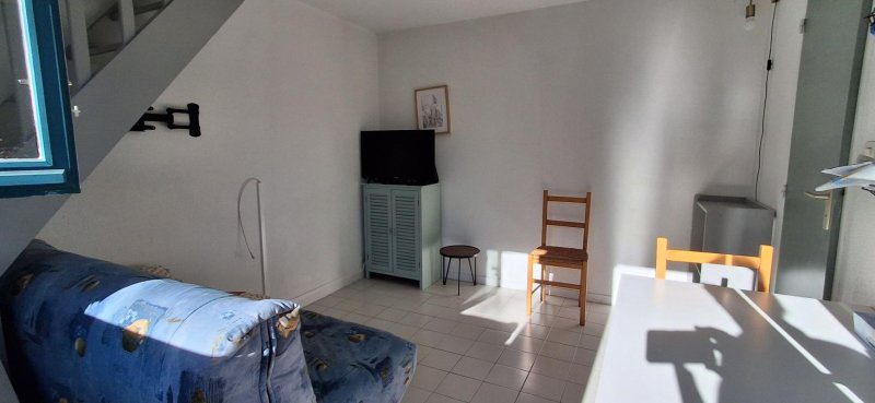Rez-de-chaussée : Une pièce de vie lumineuse avec kitchenette équipée et une salle d'eau avec WC.