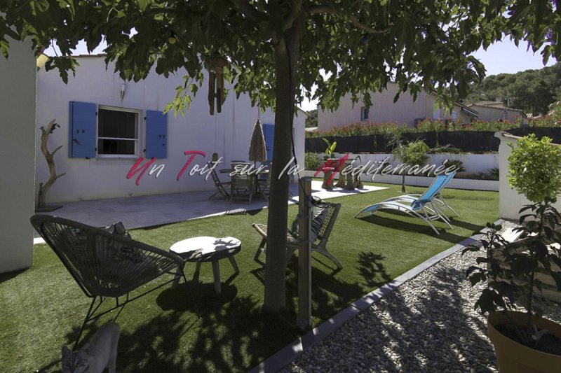 Maison de plain pied de 80m2, construite en 2016 (sous décennale), 4 pièces, 3 chambres et garage de 27m2. Agréable terrain piscinable de 450m2.