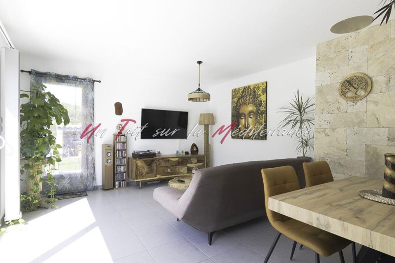 Intelligemment agencée, cette maison de 81m2 habitables de plain pied, offre un agréable salon/séjour exposé Sud et Ouest avec sa cuisine équipée ouverte pour une surface réunie d'environ 35m2.