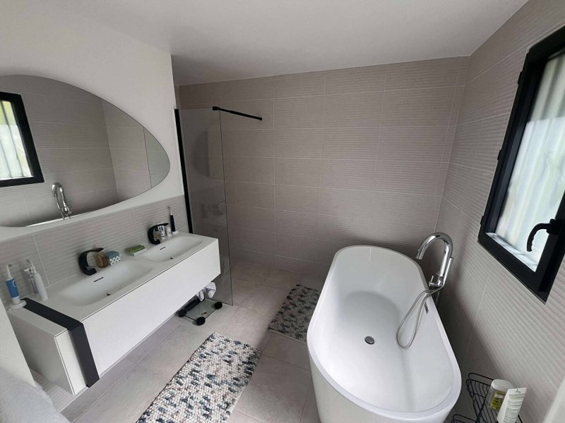 Dès l'entrée, vous découvrirez un vaste séjour lumineux exposé plein sud, avec accès direct sur l'extérieur. La cuisine ouverte, aménagée et entièrement équipée, s'intègre harmonieusement à l'espace de vie. Une suite parentale au rez-de-chaussée vous offre tout le confort avec sa salle de bains privative (douche et baignoire). Une seconde chambre avec salle d'eau, une buanderie fonctionnelle et un garage complètent ce niveau.