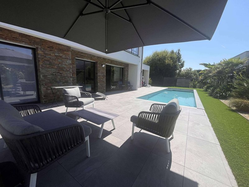 À l'extérieur, la grande terrasse plein sud vous invite à la détente autour d'une piscine creusée, chauffée, idéale pour profiter des beaux jours en toute intimité.