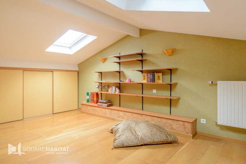 A l'étage: quatre chambres dont deux de 14 m² et une de 20 m² sur parquet ancien, une salle de bains spacieuse, un wc séparé. Grenier. Garage.