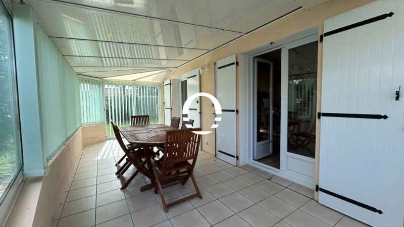 d'une entrée, salon séjour cheminée insert, une cuisine aménagée équipée, une véranda donnant sur l'arrière de la maison, deux chambres, une salle de bain, cellier , garage et d'une dépendance . Le jardin est entièrement clos. DPE en cours