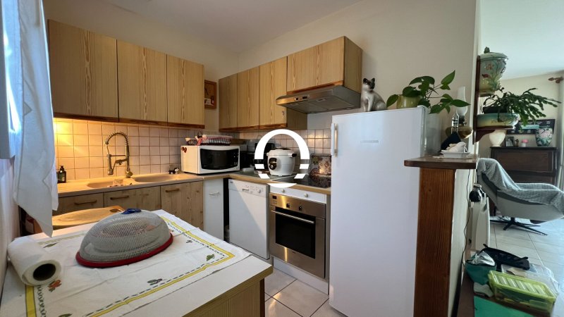 La pièce de vie avec cuisine ouverte aménagée donne accès à la terrasse et son abri équipé d'un store banne, un dégagement vous guide vers deux chambres dont une avec placard intégré, une salle de bains avec douche et un WC indépendant.