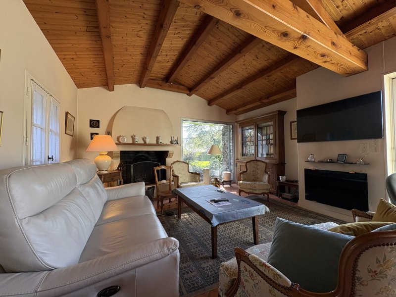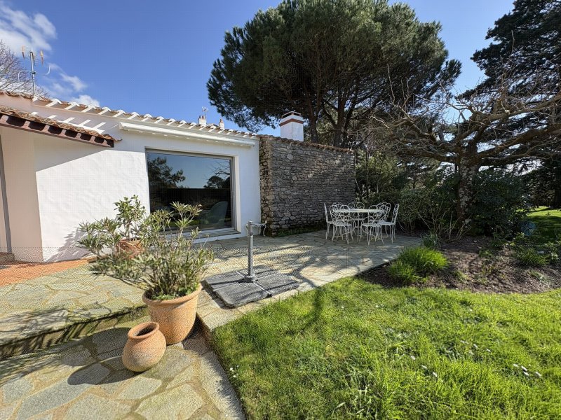 A mi-chemin entre le bourg de SAINTE MARIE et la Plage du Porteau, propriété de caractère signée Matthieu GUILLAUMET: Porte sur pivot déporté ouvrant sur le hall d'entrée, séjour disposant d'une cheminée, plafond déplafonné, ouvrant sur terrasse. Cuisine aménagée et équipée avec accès extérieur. Deux chambres en RDC dont une spacieuse de plus de 17 m2. Salle d'eau recente. A l'étage : palier : deux chambres, salle de bains avec wc. Garage, cellier. Terrasse exposée Sud-Ouest, store banne, superbe jardin arboré sans vis à vis équipé d'un forage pour arosage automatique. Agence Sainte Marie