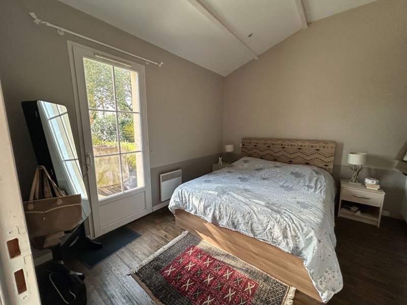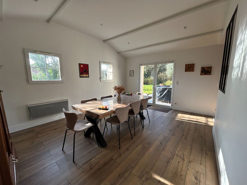 PORNIC - située en hameau à 2.5 kms des commerces au calme, MAISON A VENDRE d'environ 138 m² habitables comprenant au rez de chaussée : entrée, wc, séjour lumineux donnant sur terrasse exposée sud, cuisine ouverte aménagée et équipée, un arrière cuisine, salon avec poêle à bois, bureau, deux chambres dont une avec salle d'eau privative.