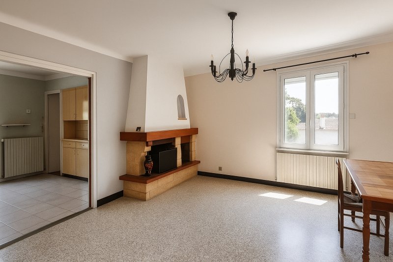 A l'étage : belle pièce de vie exposée sud avec coin cheminée, cuisine ouverte aménagée, 2 chambres avec placards, une salle d'eau avec WC.