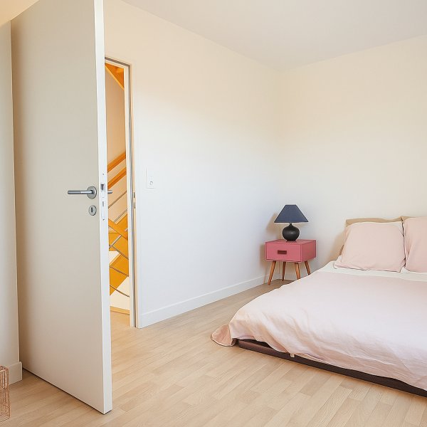 Au premier étage : 2 chambres, salle de bains avec WC. De nombreux placards optimisent le rangement.