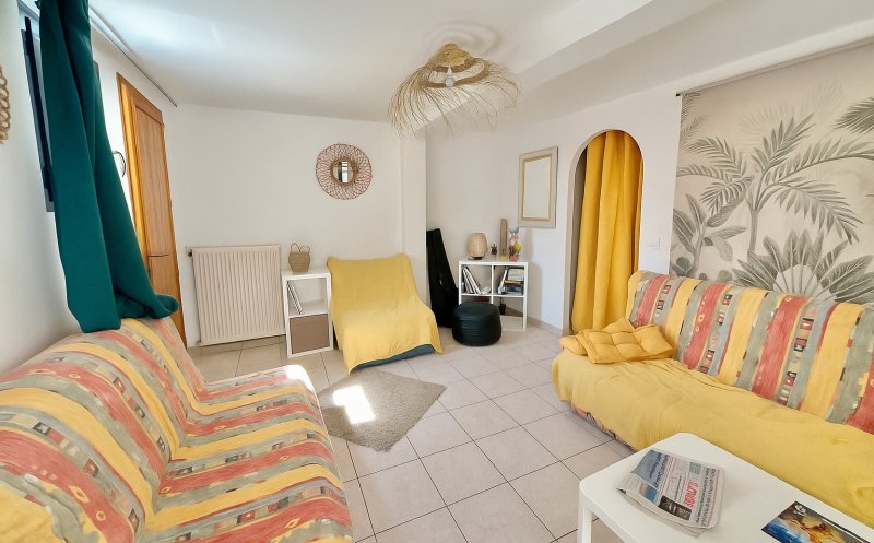 À l'étage, accessible par un escalier extérieur couvert : un salon cosy, une cuisine, deux chambres et une salle d'eau avec WC.