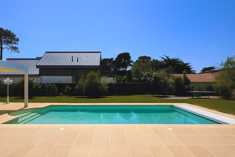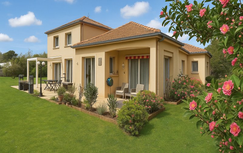 Un bureau avec accès direct a la terrasse, une lingerie, un cellier, un WC avec point d'eau. La terrasse avec véranda bioclimatique est exposée sud/ouest avec vue sur la piscine et le jardin. A l'étage, une mezzanine, 3 belles chambres, une salle d'eau et WC séparés.