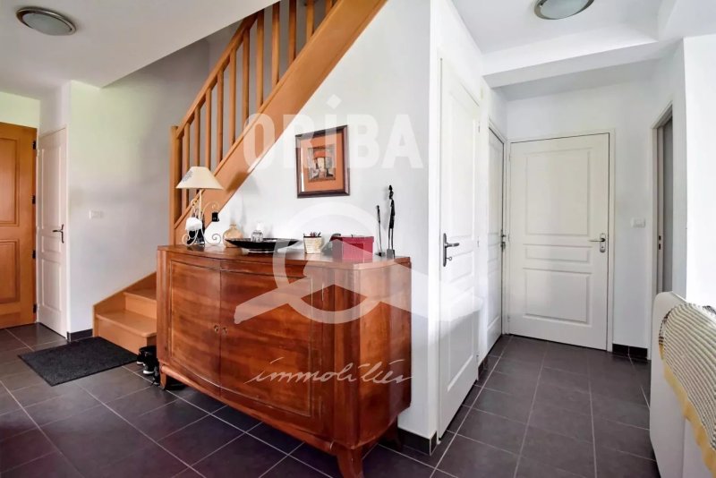 Entrée avec placard, toilettes, salon séjour ouvrant sur le jardin, cuisine aménagée et équipée, chambre, salle d'eau. A l'étage : dégagement, 3 chambres avec placards, salle de bains WC. GARAGE. +33 6 63 90 02 15 - +33 2 40 11 15 54