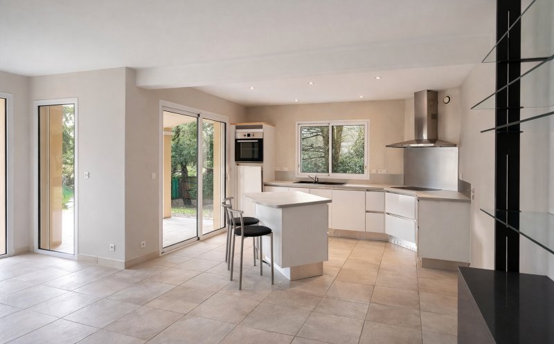 La maison permet une vie de plain pied. Le hall dessert une spacieuse et lumineuse pièce de vie avec cuisine ouverte (aménagée et équipée), l'ensemble faisant environ 65m², une suite parentale avec chambre, dressing et salle de bains. WC invités.