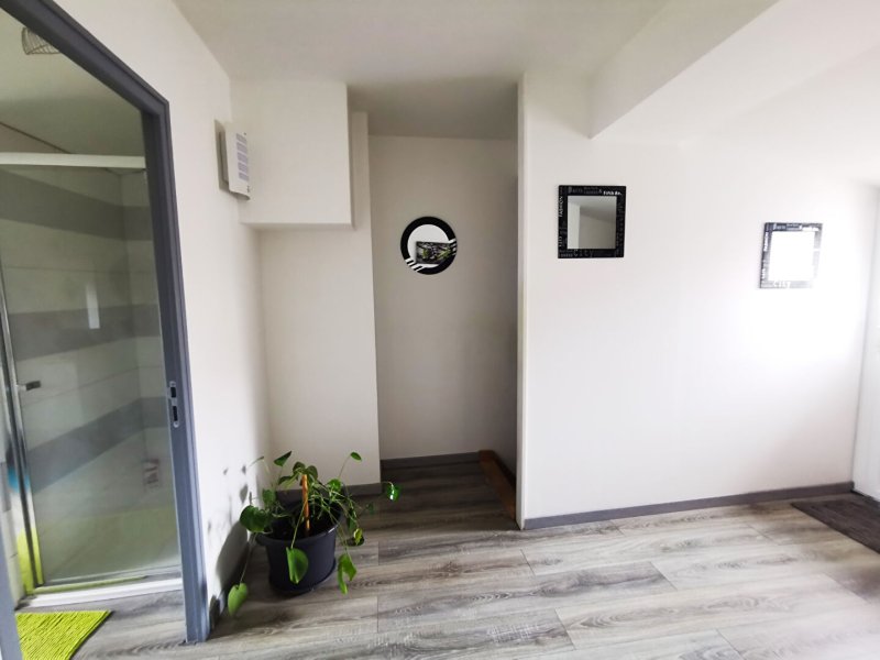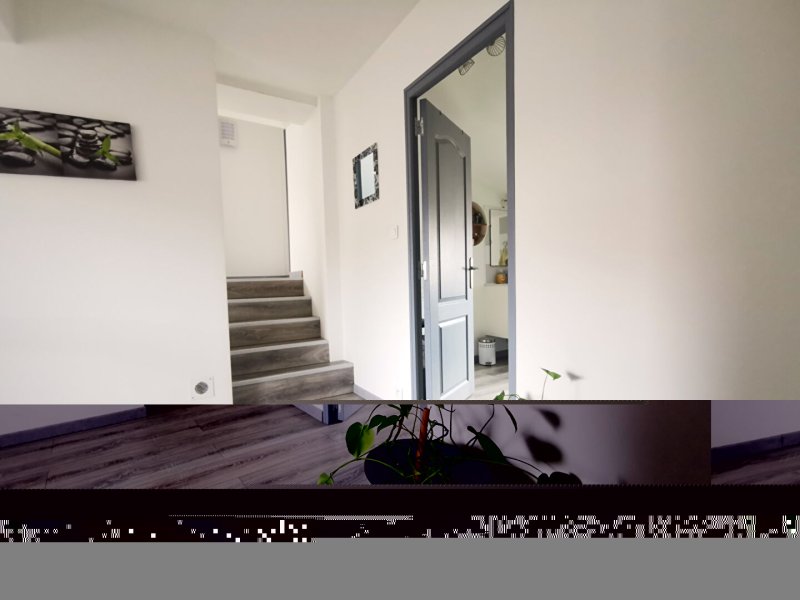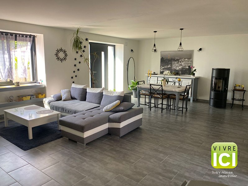 Vous entrez dans un salon séjour lumineux avec poêle a granulés, une cuisine ouverte aménagée et équipée, une buanderie ainsi qu'un dégagement qui dessert une suite parentale avec une salle de bains et douche à l'italienne, un dressing et un W.C.