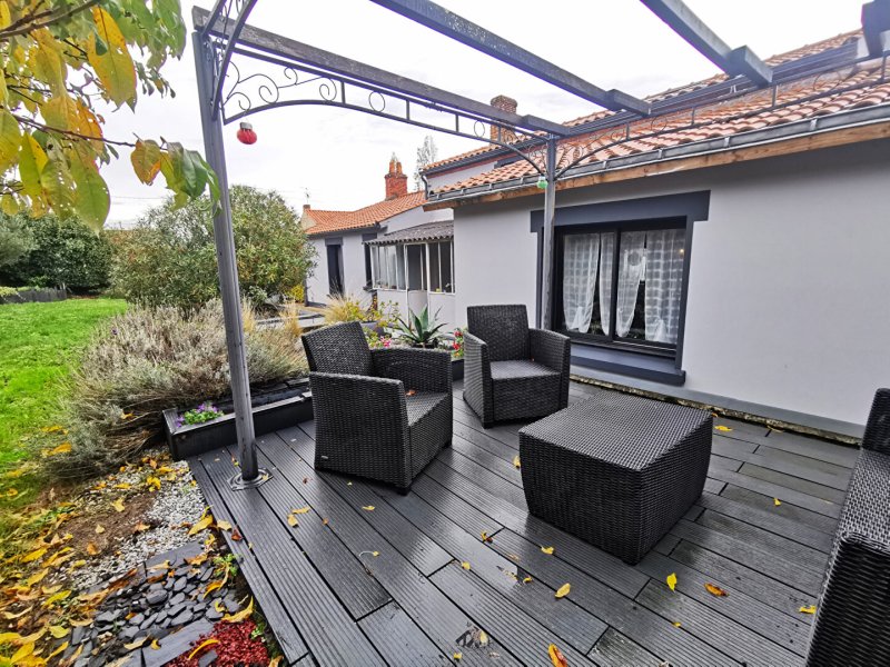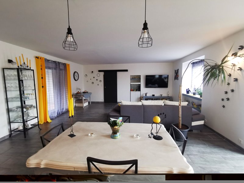 Vous entrez dans un salon séjour lumineux avec poêle a granulés, une cuisine ouverte aménagée et équipée, une buanderie ainsi qu'un dégagement qui dessert une suite parentale avec une salle de bains et douche à l'italienne, un dressing et un W.C.