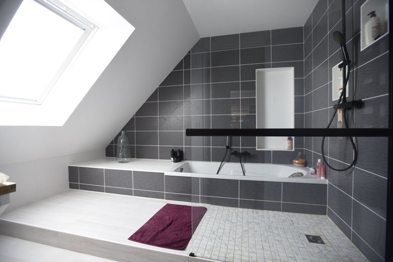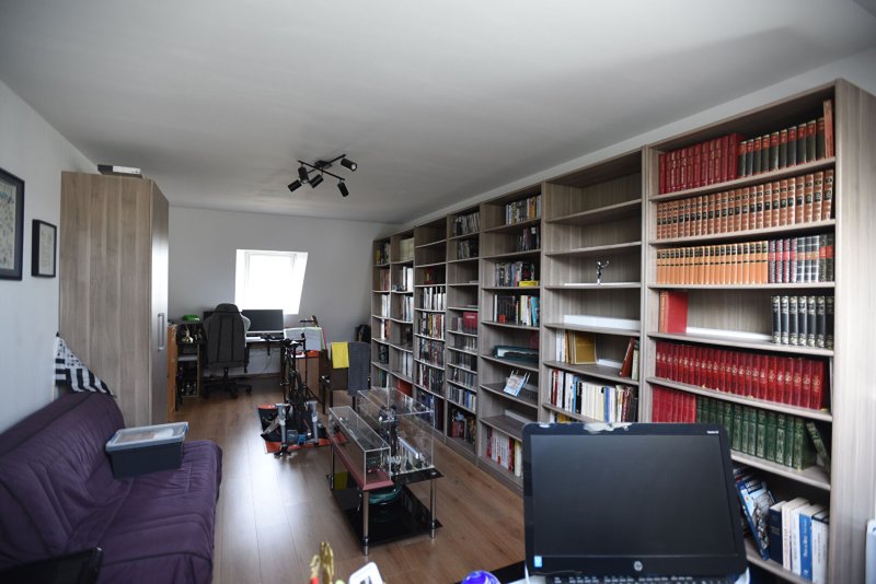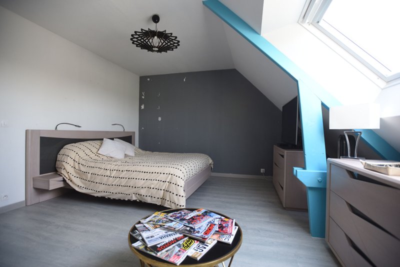 A L'ÉTAGE : UN PALIER DESSERVANT DEUX GRANDES CHAMBRES, UNE SALLE DE BAINS, UN WC ET UN VASTE GRENIER AMÉNAGEABLE DE 35 M² PERMETTANT DE CRÉER DEUX CHAMBRES SUPPLÉMENTAIRES.
