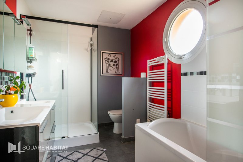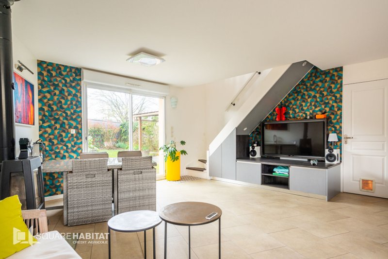 Maison, 98m² habitables, 3 chambres, garage et jardin.