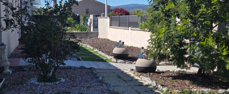 Le terrain de 500 m² , assez grand pour y installer une piscine , une partie déjà paysagée , une autre partie neutre et une terrasse côté salon / séjour