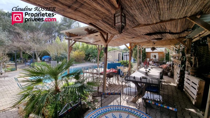 Une grande baie vitrée et une porte-fenêtre vous permettent l'accès direct à la piscine et sa grande terrasse de 200 m² aménagée en plusieurs espaces comprenant un coin salon, une cuisine d'été et sa salle à manger, un boulodrome et divers cabanons et chalet de jardin.