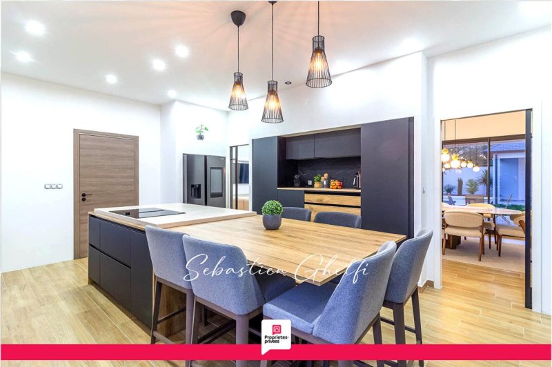 vaste entrée, grande salle de vie avec belle hauteur de plafond ouvrant sur plusieurs terrasses dont 1 couverte ,belle cuisine équipée- 4 chambres dont 1 suite avec dressing et salle d'eau, grande buanderie, salle de bain avec baignoire et douche, 3 WC, grand cellier, 2 garages dont 1 grand , 2 terrasses couvertes, local technique et douche et wc, belle piscine sur parcelle de 1500 m² .