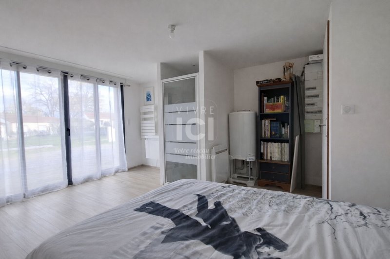 Elle propose une belle pièce de vie lumineuse d'environ 60 m², équipée d'un poêle à granulés, comprenant une entrée avec placard, une cuisine aménagée et équipée fonctionnelle, ainsi qu'un salon/séjour convivial.