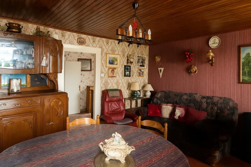 Au rez-de-chaussée : une véranda en guise d'entrée, un séjour, un coin cuisine, une cuisine avec accès à une cave, une salle de bains (avec accès a un grenier), une chaufferie et un WC séparé.