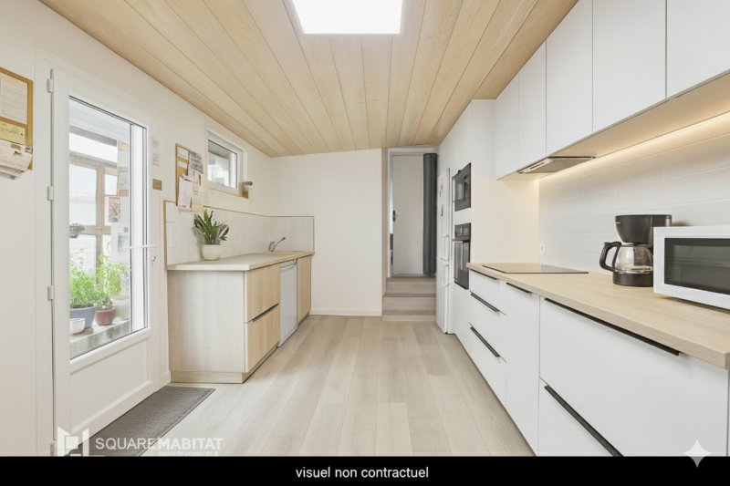 - Au rez-de-chaussée : une cuisine aménagée, un salon avec insert, une salle d'eau, un WC, ainsi qu'une chambre d'environ 18 m².