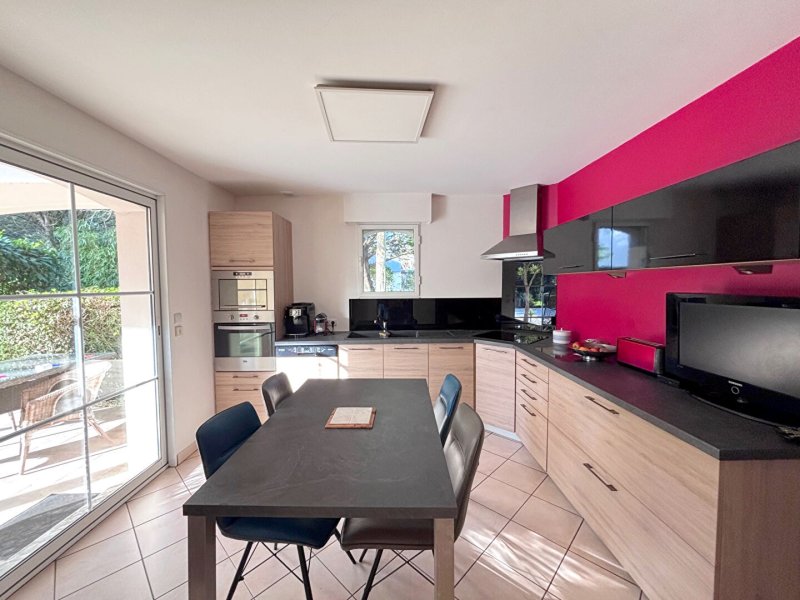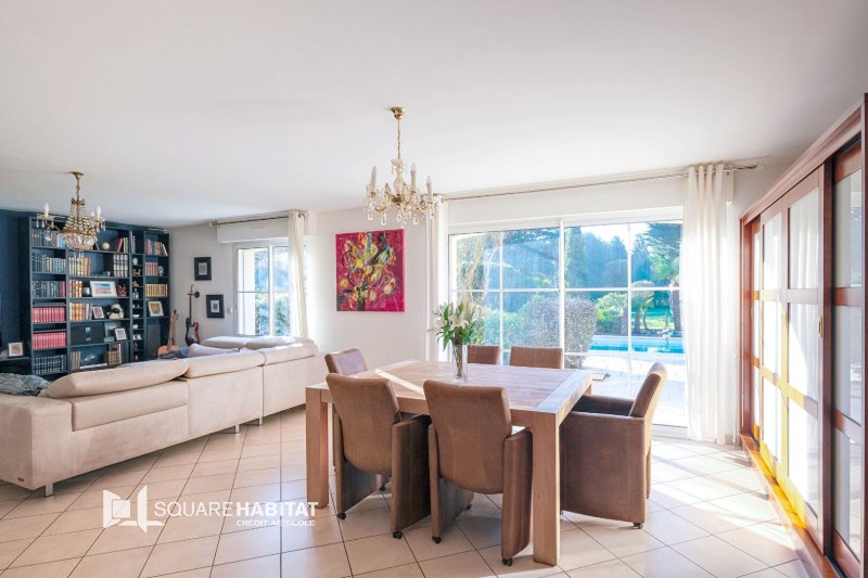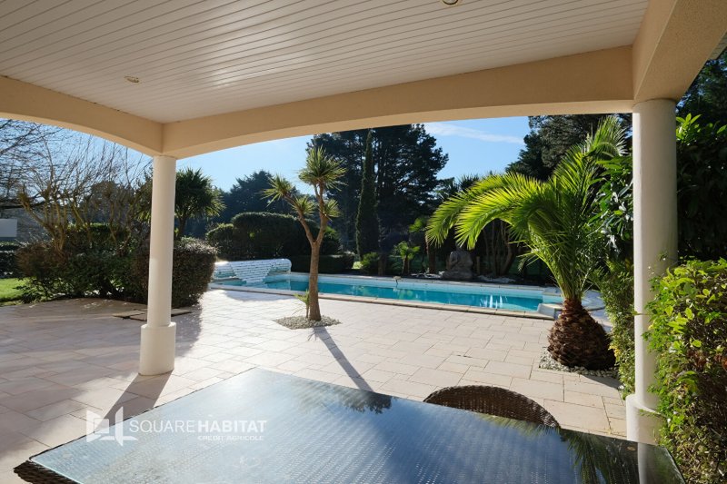 Elle se compose en rez de chaussée d'une vaste entrée, d'une pièce à vivre baignée de lumière donnant sur une terrasse de 125 m² avec piscine, d'une cuisine aménagée et équipée, d'une suite parentale, d'une lingerie et d'un garage de 43m².