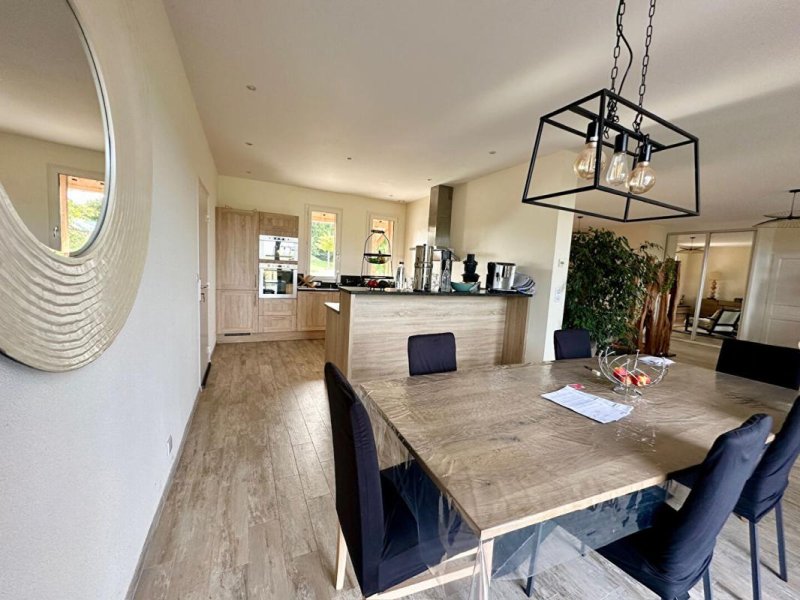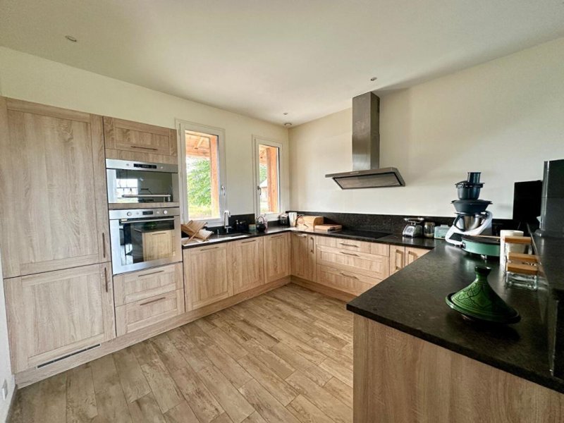 La cuisine moderne, aménagée et équipée, avec espace dînatoire, s'ouvre naturellement sur le salon et sur une vaste terrasse en bois exposée Est-Ouest.