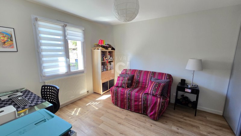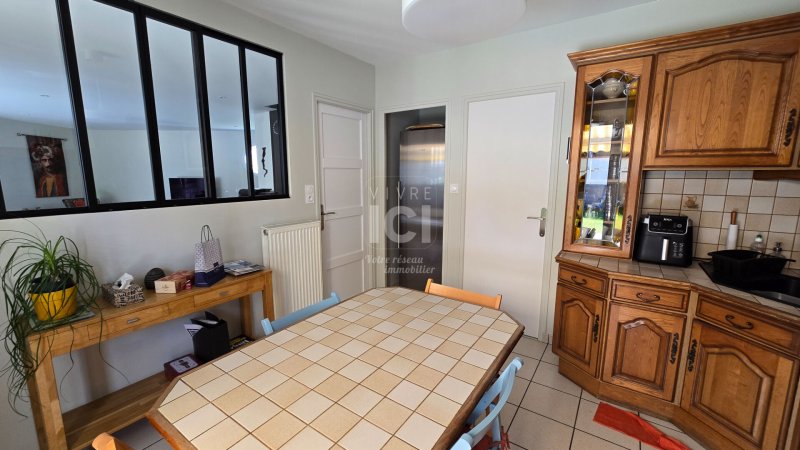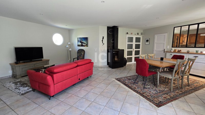Elle offre une belle pièce de vie lumineuse avec poêle à pellets, cuisine indépendante aménagée et équipée, cellier, 3 chambres avec placards, salle d'eau avec douche à l'italienne, 2 WC, garage avec mezzanine. Carport